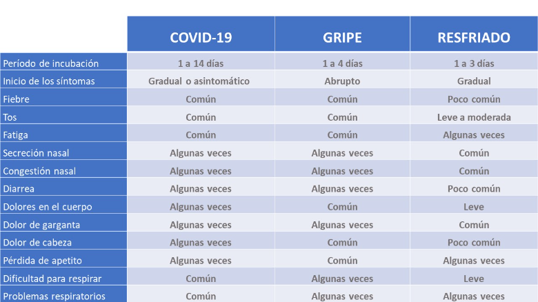 - El período de incubación de COVID-19 se estima entre 1-14 días (siendo el periodo de incubación medio de 5-6 días), mientras que el resfriado común y la gripe suelen ser de 1-3 y 1-4 días respectivamente.